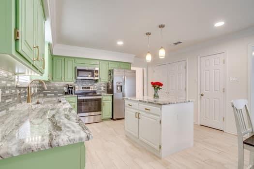 The living room offers a comfortable atmosphere highlighted by an updated wood-burning fireplace and opens seamlessly to the breakfast area and kitchen. The tastefully updated kitchen features an island, ample cabinetry, and generous storage. A spacious dining room is perfect for gatherings with family and friends. A convenient half bath is located on the main level for guests.