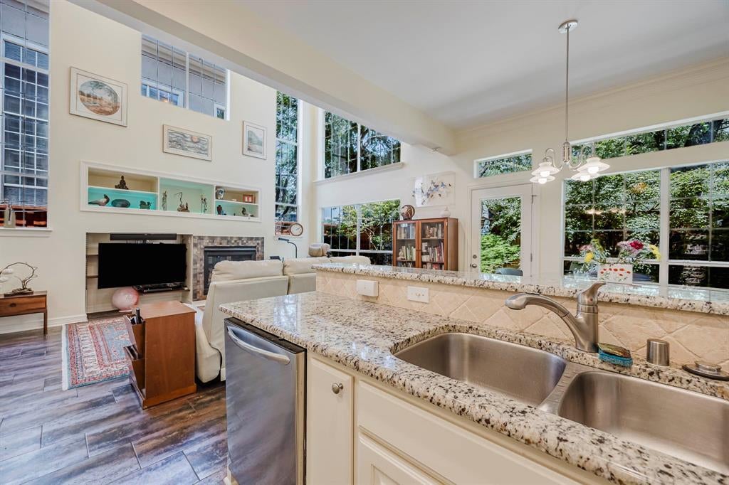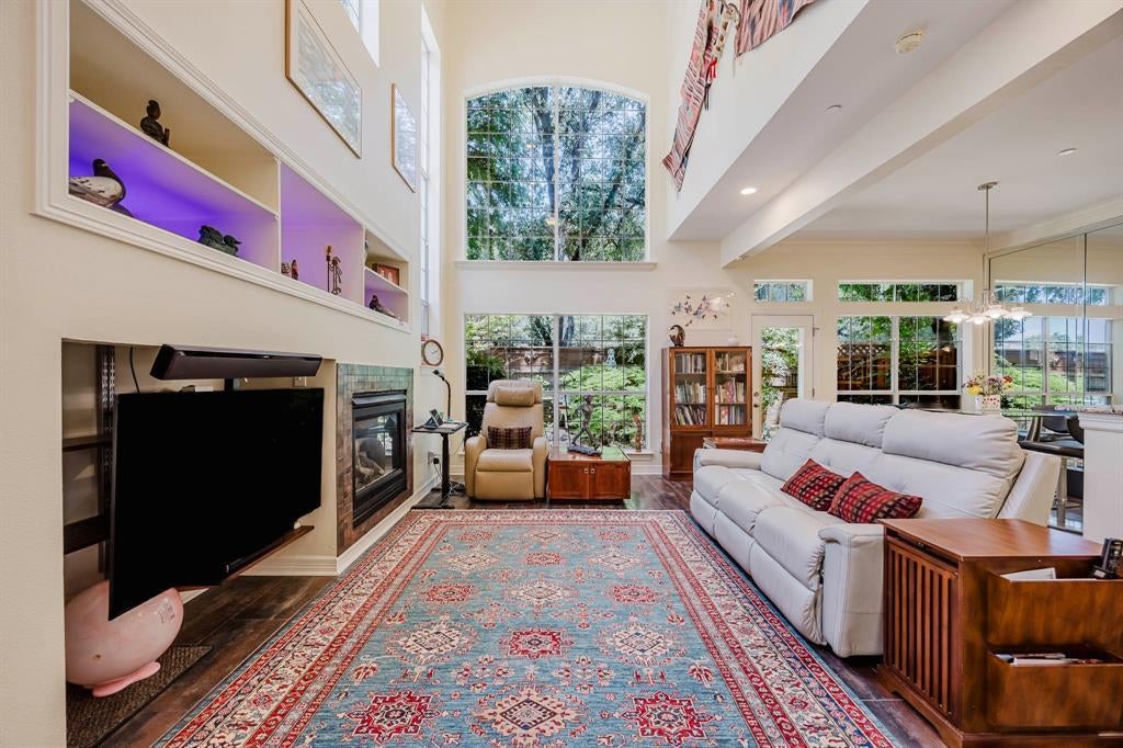 This exceptional residence leaves a lasting impression from the moment you arrive. Once you step into the foyer you will be welcomed by a dramatic living room featuring soaring 23-foot ceilings and expansive windows that flood the space with natural light, effortlessly blending outdoor beauty with luxurious interiors. Elegant tile flooring and a striking gas fireplace framed in imported Italian tile create an atmosphere that is both refined and inviting. The open-concept design flows effortlessly into the dining area, where floor-to-ceiling windows and a mirrored wall enhance the airy ambiance and frame peaceful views of the beautifully landscaped backyard, complete with a discreet doggy door for your small pet’s convenience. The galley-style kitchen is as functional as it is stylish, offering gleaming granite countertops, abundant cabinetry, a gas cooktop, microwave-convection oven, and a tasteful tile backsplash. Upstairs, a loft-style landing with built-in bookcases overlooks the stunning living space below, providing the perfect setting for a home office, library, or creative studio. A spacious secondary bedroom offers comfort and flexibility, while the expansive primary suite is a serene retreat designed for rest and rejuvenation. Outdoors, meticulously landscaped grounds and an extra-tall privacy fence create a secluded backyard ideal for quiet mornings or relaxed conversations. HOA amenities include front yard maintenance and access to the community pool, and with a one-time $10 registration fee, residents may join the athletic club to enjoy a wide range of activities and amenities—with no monthly fees.
