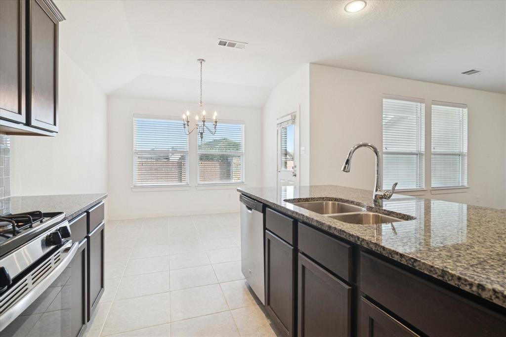 The heart of the home is the gourmet kitchen, featuring rich granite countertops, stainless steel appliances, and an open design that flows seamlessly into the living and dining spaces—perfect for entertaining or relaxed evenings at home. Tile flooring throughout adds a clean, cohesive look and easy maintenance.