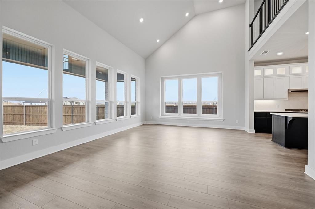 Home Office With French Doors Set At Two-story Entry. Open Kitchen Hosts Inviting Island With Built-in Seating Space And A 5-burner Gas Cooktop. Two-story Dining Area Opens To Two-story Family Room With A Wood Mantel Fireplace And Wall Of Windows....
