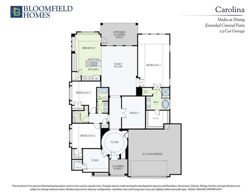 NEW! NEVER LIVED IN. Ready April 2026. Great single-story design from Bloomfield Homes, the Carolina offers 3 bedrooms, 2 baths, and a 2.5 car garage with cedar doors, within a smartly connected layout. The home makes an immediate impression with a brick and stone exterior and a welcoming covered front porch, while an extended covered patio at the rear expands the living space outdoors. Nail-down hardwood flooring runs through the main traffic areas, creating a polished foundation as the foyer opens into a light-filled family room at the heart of the home. The kitchen and breakfast area sit just beyond, creating an open concept, highlighted by the Signature Series deluxe kitchen featuring quartz countertops, built-in stainless steel appliances, and a glass pantry door. The layout flows naturally into the family room and out to the covered patio, reinforcing the home’s easy, open feel. A dedicated media space adds versatility for everyday use or relaxed evenings in. The primary suite is privately arranged and offers a sitting area in the bedroom, a generous walk-in closet, and a garden tub with a separate shower. 2 secondary bedrooms are arranged efficiently along the front and side of the home, supported by a shared full bath, while a study with glass French doors provides a quiet, defined space near the entry. Throughout the home, practical upgrades include a gas stub at the patio, 2 inch faux wood blinds, a Christmas light package, and a patio ceiling fan with a light kit. Set within the Meraki community, this home enjoys a setting shaped by open green space, planned trails, and a layout designed to connect residents to the outdoors. Visit the Bloomfield Homes model for details on the Carolina!