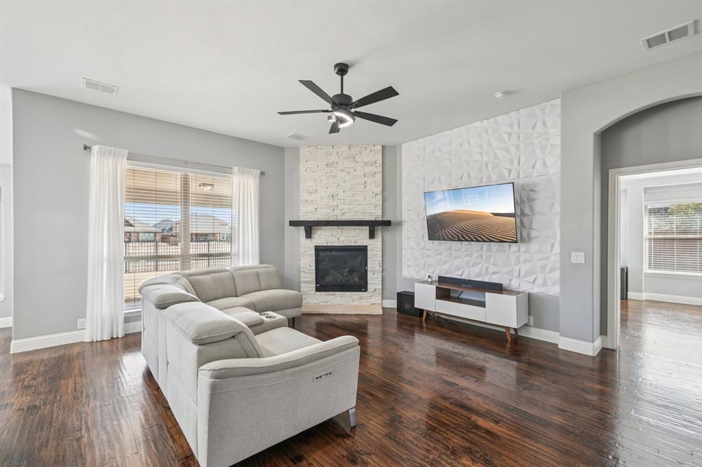 Nestled on a spacious corner lot in the beautiful Argyle community of Country Lakes, this stunning 4-bedroom, 3-bathroom home offers both elegance and comfort. A striking rotunda entry welcomes you inside, where rich hardwood flooring flows throughout most of the lower level. The inviting living room features a floor-to-ceiling stacked stone fireplace and opens seamlessly to the gourmet kitchen, complete with white cabinetry, large island, granite countertops, gas cooktop, and walk-in pantry. The sunlit breakfast room boasts a built-in buffet and cozy window seat, perfect for everyday dining. The expansive primary suite offers a relaxing seating area with bay window and an ensuite bath featuring an oversized shower with bench seat, garden tub, and walk-in closet. Two secondary bedrooms with built-ins and a dual-sink bathroom are conveniently located downstairs, along with a private office with walk-in closet and a formal dining room for entertaining. Upstairs, enjoy a large game room with window seat, a dedicated media room for movie nights, a generously sized fourth bedroom and a full bath. Step outside to the covered patio overlooking the backyard and serene pond behind the home. Country Lakes amenities include two community pools, playgrounds, walking trails, and a dog park—all in a fantastic location close to shopping, dining, and entertainment.