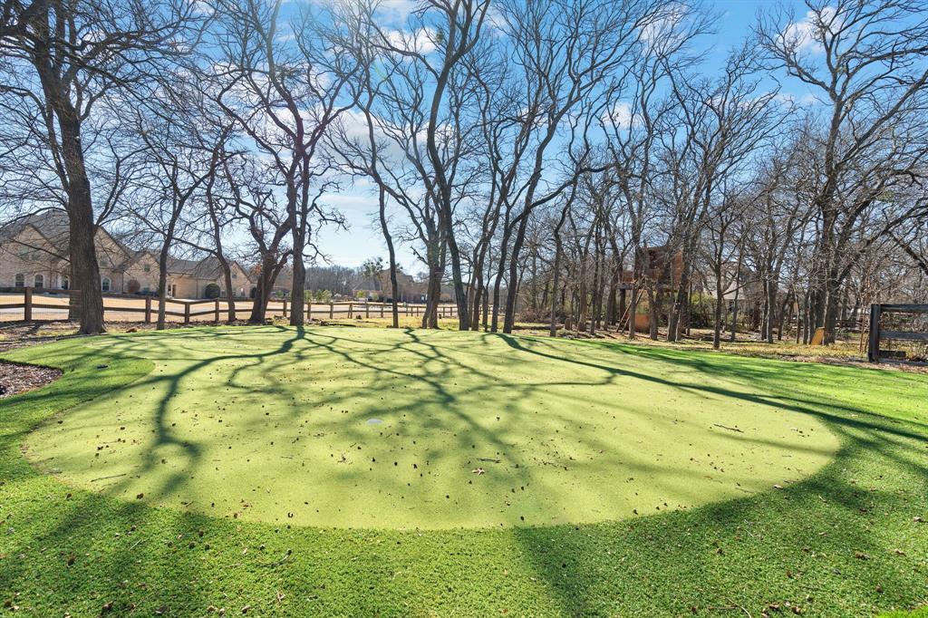 Experience refined country living without Argyle city taxes. Tucked into the charming Steeplechase pocket neighborhood, this exceptional corner-lot property offers privacy, space, and elevated outdoor living on one of the largest lots in the neighborhood. The expansive backyard is designed for connection and relaxation, featuring a lit golf green, outdoor living and dining areas, outdoor kitchen with Bull appliances, raised garden beds, a heated pool and hot tub, a chicken coop, and plenty of room to play, entertain, or unwind. The front yard showcases expansive flower beds, visually striking mature trees, and a cozy front porch that's perfect for enjoying your morning coffee Inside, a striking wall of windows frames the backyard and fills the home with natural light. The front library offers a cozy retreat and can also serve as an elegant formal dining space. The spacious, gourmet kitchen opens seamlessly into the oversized living and dining areas, ideal for hosting or everyday living. A private secondary bedroom downstairs provides a perfect guest space. The primary suite is a true retreat, featuring a spa like bathroom with a freestanding soaking tub, lighted mirrors, and a large walk-in closet designed for both luxury and function. Upstairs, enjoy a generous secondary living area and four additional bedrooms with spacious closets, plus a Jack-and-Jill bath designed for comfort and convenience. One bedroom has double doors and is currently being used as an office. A three-car garage offers ample storage and parking. The third bay has blown in insulation and an HVAC unit, perfect for a gym or shop. A circular drive, oversized driveway add both convenience and stunning curb appeal. This home truly offers it all.