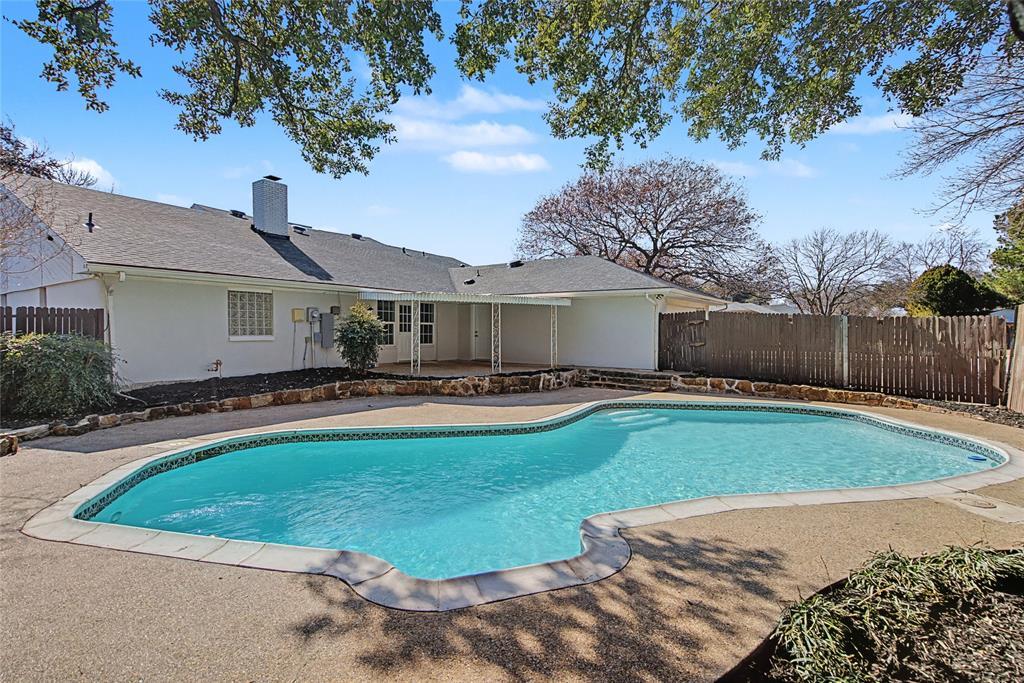 Come check out this updated 4 bedroom 3 bathroom home with a pool in the heart of Plano. This home features LVP floors throughout. NO CARPET! It has quartz counter tops, white cabinets, and stainless steel appliances. The breakfast room has extra long windows allowing natural light all the way through the kitchen. The large living area features a wet bar, built-in bookshelf, and a stone fireplace. The primary bathroom has quartz as well with a garden tub and standing shower. This home is incredible, bright, airy. Don't miss this great opportunity.